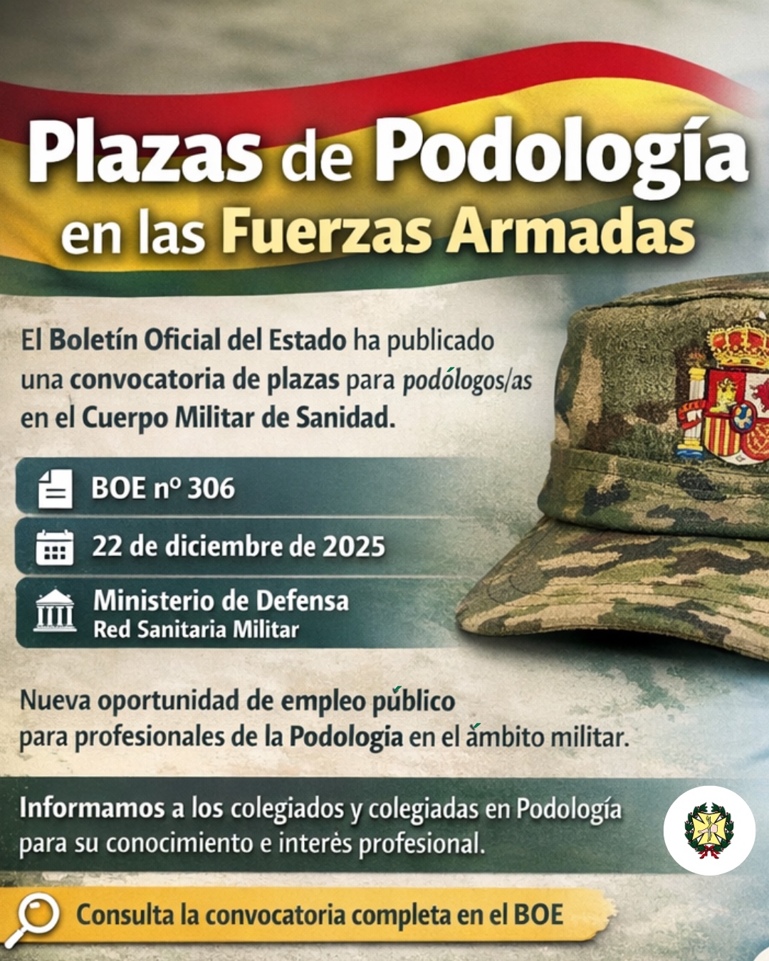 Siguiendo las indicaciones de la Presidenta del Consejo, la Sra. Carrascosa, se adjunta, para su difusión entre sus colegiados, el Boletín Oficial del Estado número 306 del lunes 22 de diciembre de 2025 en el que se publica la Resolución 430/38533/2025, de 9 de diciembre, de la Subsecretaría, por la que se convoca proceso selectivo, por el sistema general de acceso libre, para el acceso a la condición de personal estatutario fijo en plazas de la categoría de Enfermero/a, de Enfermero/a especialista en Enfermería Obstétrico-Ginecológica (Matrona), de Fisioterapeuta, de Logopeda, de Óptico/a-Optometrista, de Podólogo, y de Terapeuta Ocupacional, en la Red Sanitaria Militar.